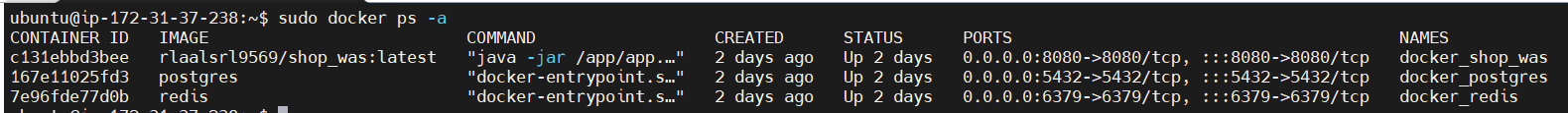 위 명령어를 통해 docker-compose를 실행시키면 was, db, redis를 한 번에 구동시킬 수 있다.