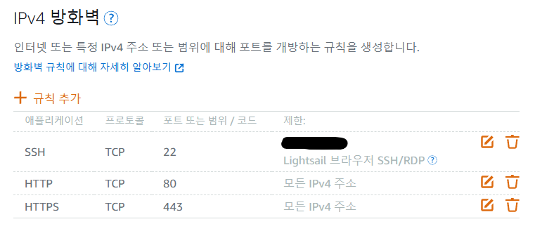 lightsail 인스턴스를 처음 만들었을 때 방화벽에 ssh와 http만 적용되어 있기 때문에 https도 추가해줘야 한다.