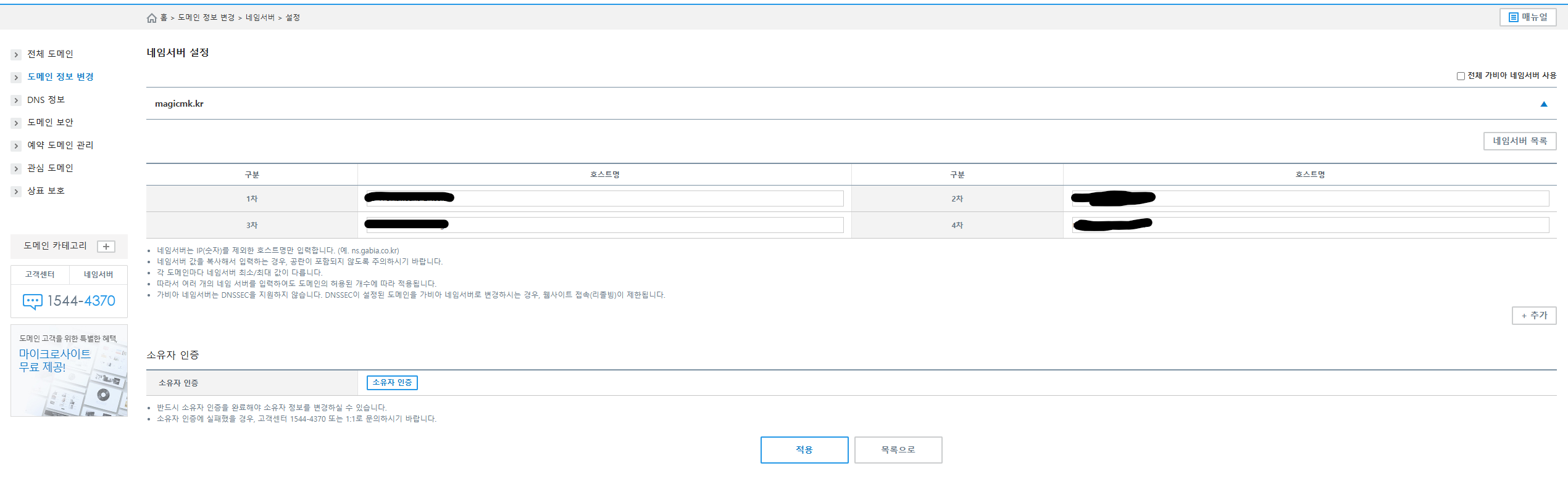 네임서버는 도메인 등록할 때 제공해 준 4개의 네임서버를 사용한다.