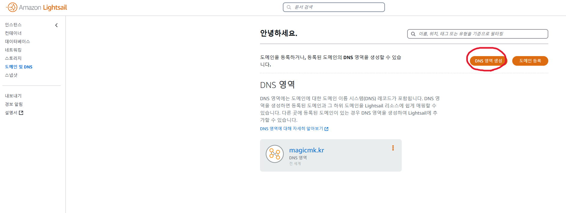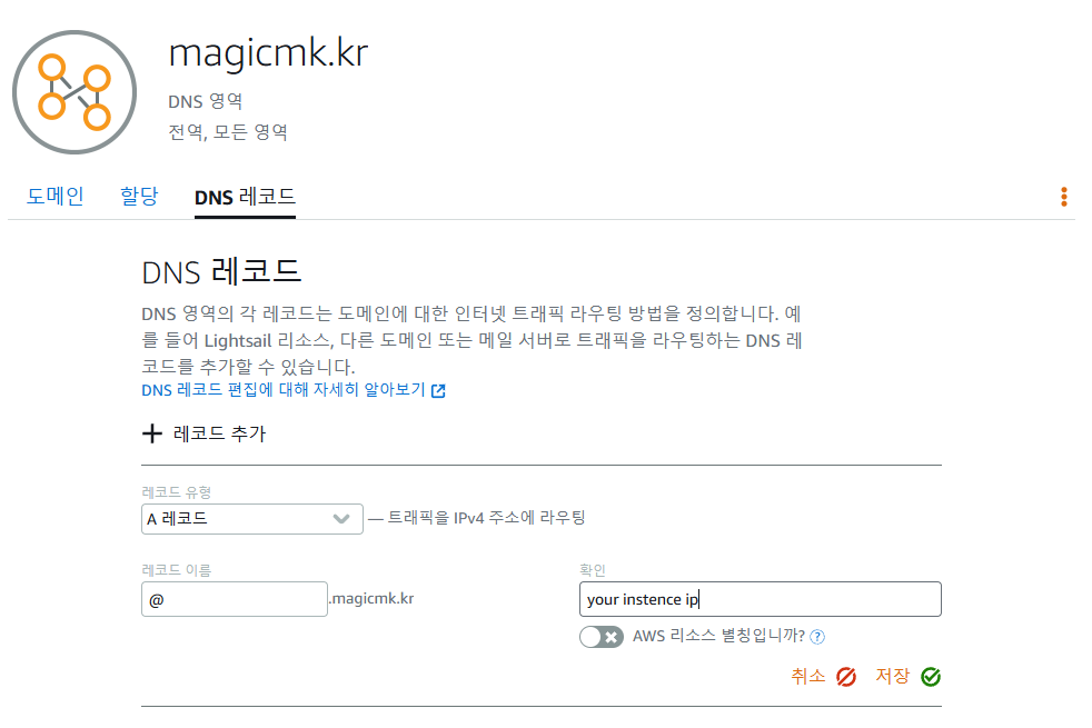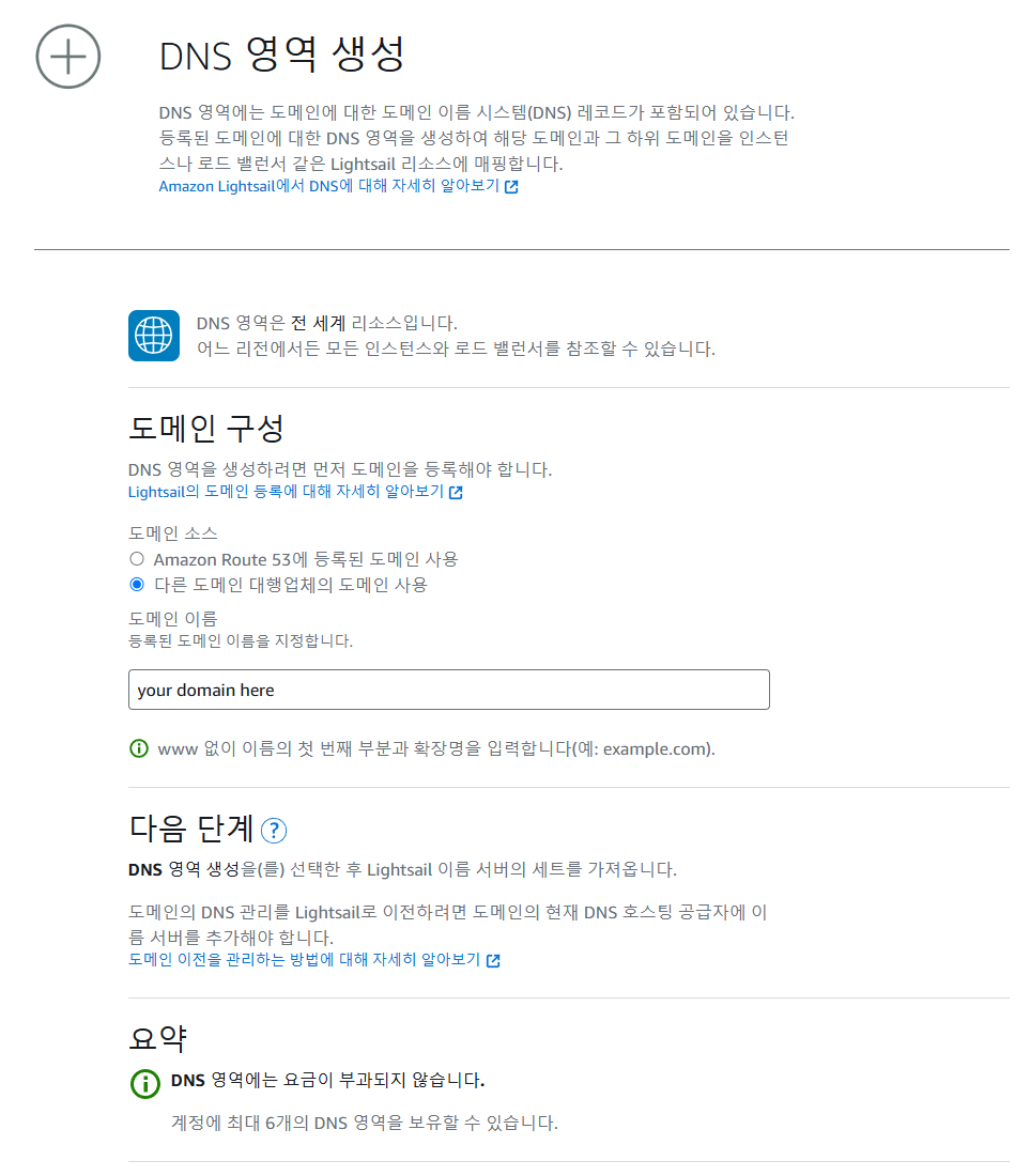 도메인을 구매했다면 lightsail 콘솔로 돌아가 구매한 도메인을 등록해야 한다.