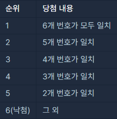로또 6/45(이하 '로또'로 표기)는 1부터 45까지의 숫자 중 6개를 찍어서 맞히는 대표적인 복권입니다. 아래는 로또의 순위를 정하는 방식입니다.