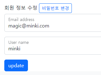 DTO를 반환 받아서 Email과 User name을 보여주고 email은 pk라 변경할 수 없으니 readonly를 걸어주고