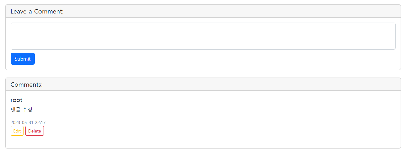 이런 식으로 댓글을 작성하고 수정 및 삭제가 가능하도록 구현하였다.