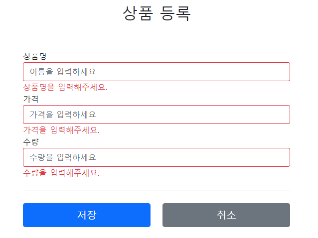 이전 포스팅에서 작성했던 Thymeleaf 폼의 th:errors를 이용하면 특별한 로직 없이 자동으로 검증 결과를 출력한다.